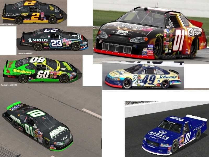 The #01 MBNA Car is one I drove in the JNS Cup series, won 8 races and a championship in it over a 3 year period. The #01 Monaco/ mbna Truck I drove part time in the JNS trucks series this last year, won 2 races this year in it, and 20 other races I shoulda, coulda, woulda won, but stuff happens :P The other cars are either reproductions of real cars, or ones I did for the fun of it