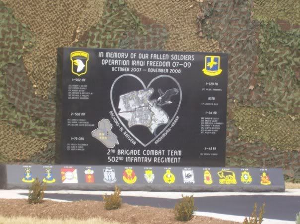 My son and the other fallen 101st Airborne "five oh deuce" troops lost in this last deployment to Iraq will have their monument and names unveiled tomorrow at Ft Campbell. Please take a moment for them tomorrow and thank them for their sacrifice. Work will keep me from this one, but my wife is as we speak being picked up at the Nashville airport by an escort (one of my son's NCO's) and a driver (My son's best friend). We didn't get to meet either of these fine men as they were in a security detachment and had to stay on the ground in Iraq for a couple more weeks. We here there to see everyone else come home, hug the hell out of them and thank them for being there for my son. These are better men than I ever will be.