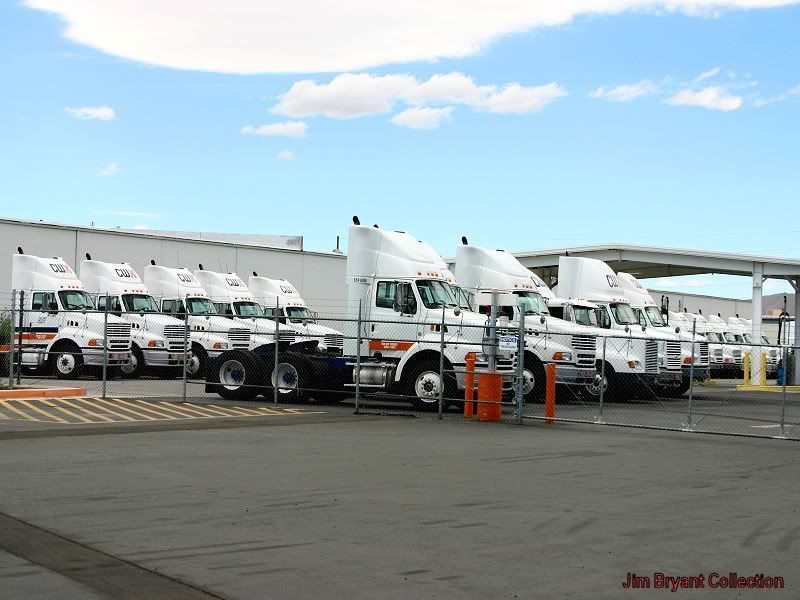 We only use our reverse rockies for P&D; in this case we are pullling out of a customer where a fully "loaded" trailer may have 6-10k in it, so weight is not much of an issue. We mostly have single screw sterlings, but for the past two years locations in Western that see a lot of snow like Reno, Boise, etc have been getting twin screw line units. We also have a handful of Old Freightliners and brand spankin' new Volvos (8k on the odo) that are used for team runs. This pic is of our power line on a Sat last summer: http://i100.photobucket.com/albums/m...7-30-06_01.jpg Ian |